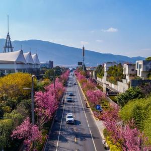 当日,云南省昆明市阳光明媚。在昆明市一些路段,道路旁种植的冬樱花在蓝天下绽放,美景如画。