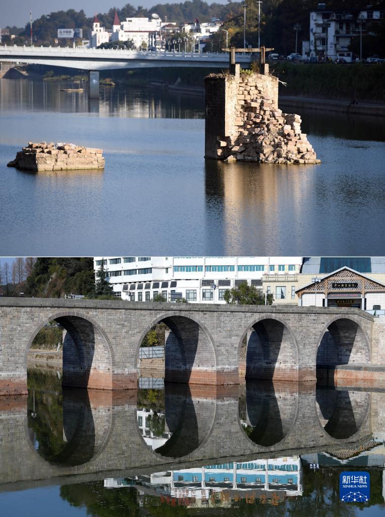 这是一张拼版照片。上图:2020年11月12日拍摄的被冲毁后遗留的镇海桥桥墩(新华社记者周牧摄);下图:12月21日拍摄的完成修缮后的镇海桥(新华社记者刘军喜摄)。