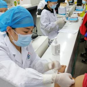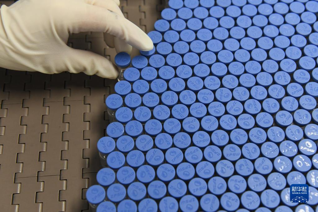 在安徽智飞龙科马生物制药有限公司新冠疫苗生产线上,工作人员将疫苗放入传送带(5月25日摄)。