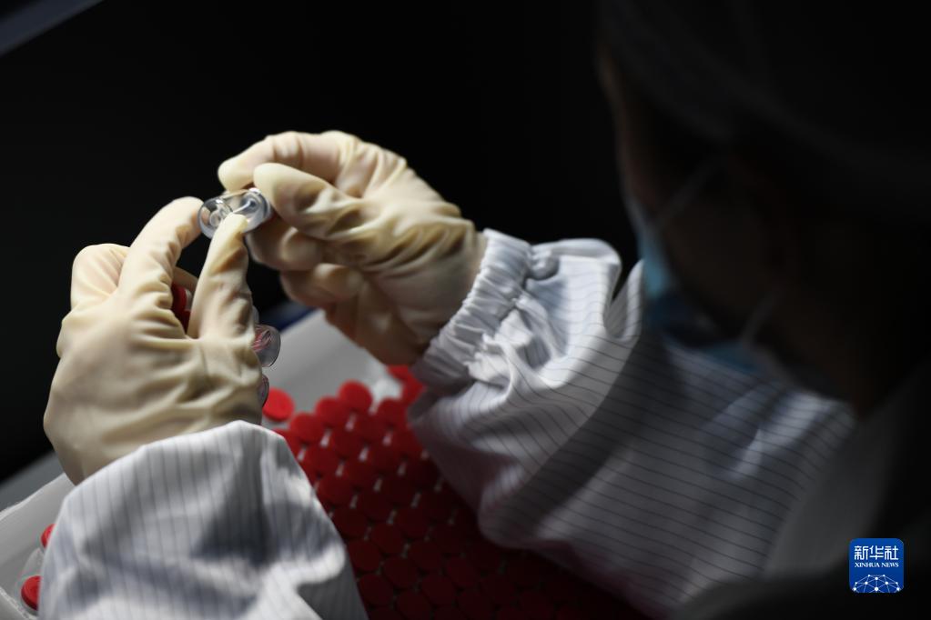 在安徽智飞龙科马生物制药有限公司新冠疫苗生产线上,工作人员对疫苗进行人工检测(5月25日摄)。