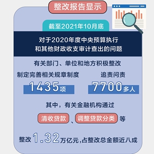 截至2021年10月底,对于2020年度中央预算执行和其他财政收支审计查出的问题,有关部门、单位和地方积极整改,制定完善相关规章制度1435项,追责问责7700多人,其中,有关金融机构通过清收贷款、调整贷款分类等整改1.32万亿元,占整改总金额近八成。