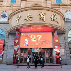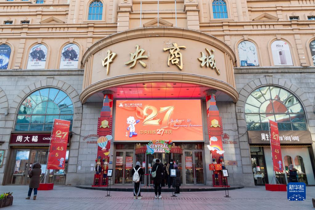 12月22日,在哈尔滨市中央大街,市民扫码进入大型商场。