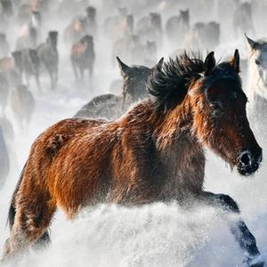 冬日,在新疆伊犁哈萨克自治州昭苏县,骏马奔驰在雪原上,成为当地冬季特有的风景。