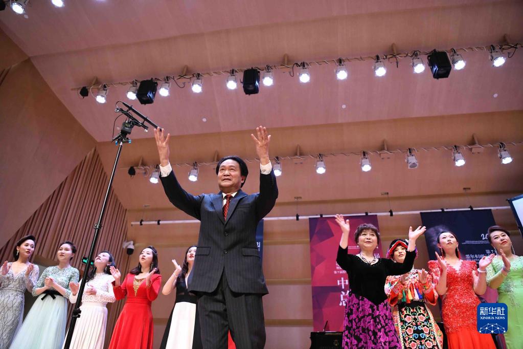 2021年12月12日,在成都城市音乐厅,敖昌群(前)与妻子率领的莉娟金蔷薇女子合唱团与观众互动。新华社记者 刘坤 摄