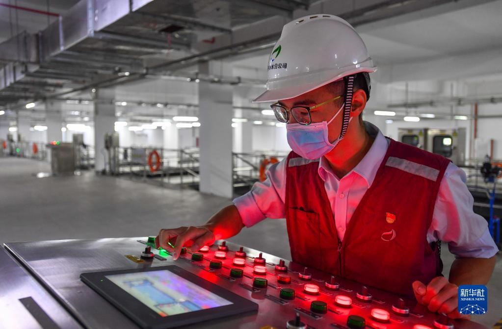 技术人员在广州石井净水厂地下车间查看设备运行情况(11月19日摄)。
