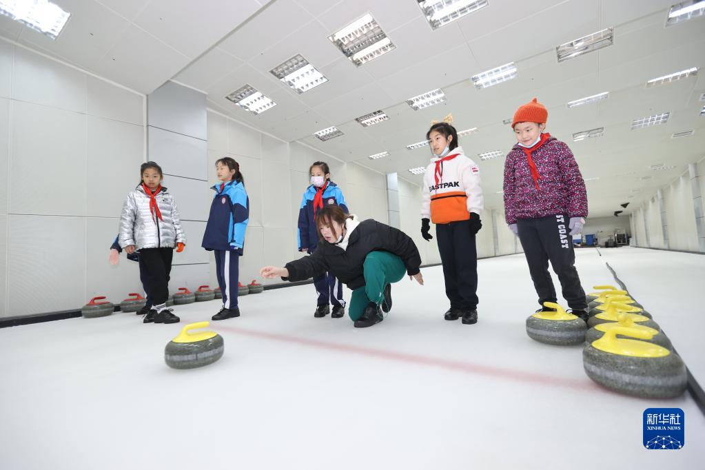 在黄浦区卢湾青少年业余体育学校,专业教练在为卢湾一中心小学的学生示范冰壶练习动作(12月8日摄)。