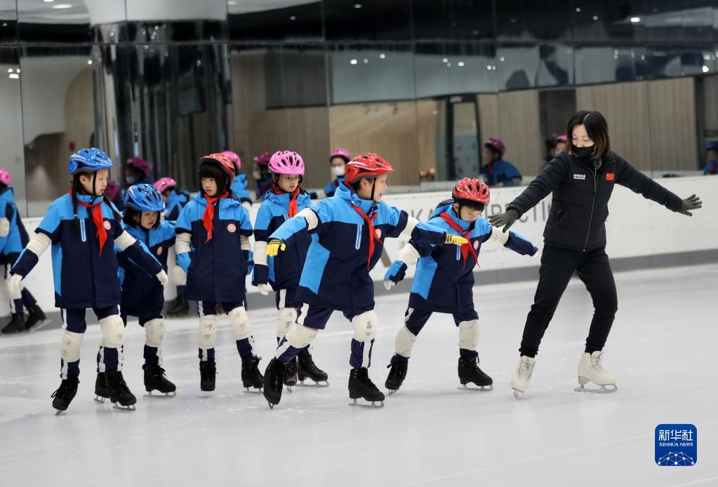 在上海新世界城的冰雪乐园,黄浦区卢湾一中心小学的学生在教练的指导下练习滑冰(12月22日摄)。