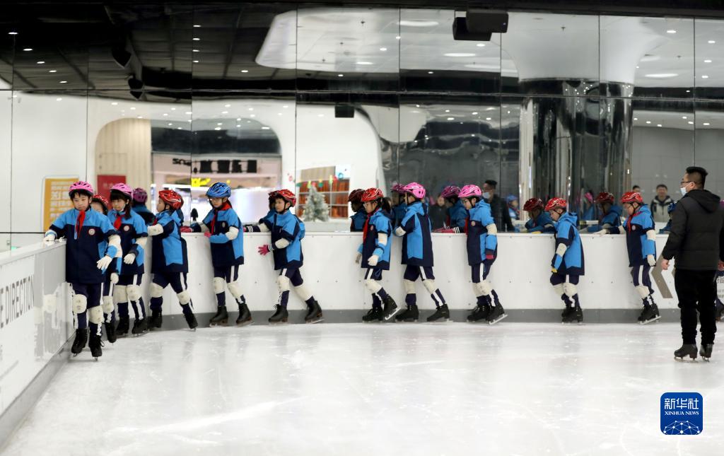 在上海新世界城的冰雪乐园,黄浦区卢湾一中心小学的学生在学习滑冰(12月22日摄)。