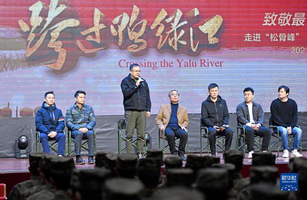 《跨过鸭绿江》电影制片人李萧(左三)与官兵互动交流(12月23日摄)。