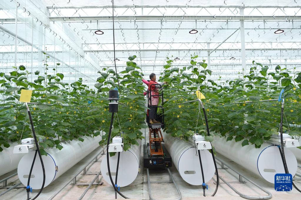 9月16日,工作人员在浙江省嘉兴市一家农业数字化工厂的种植车间内乘轨道升降车对蔬菜进行日常管理。