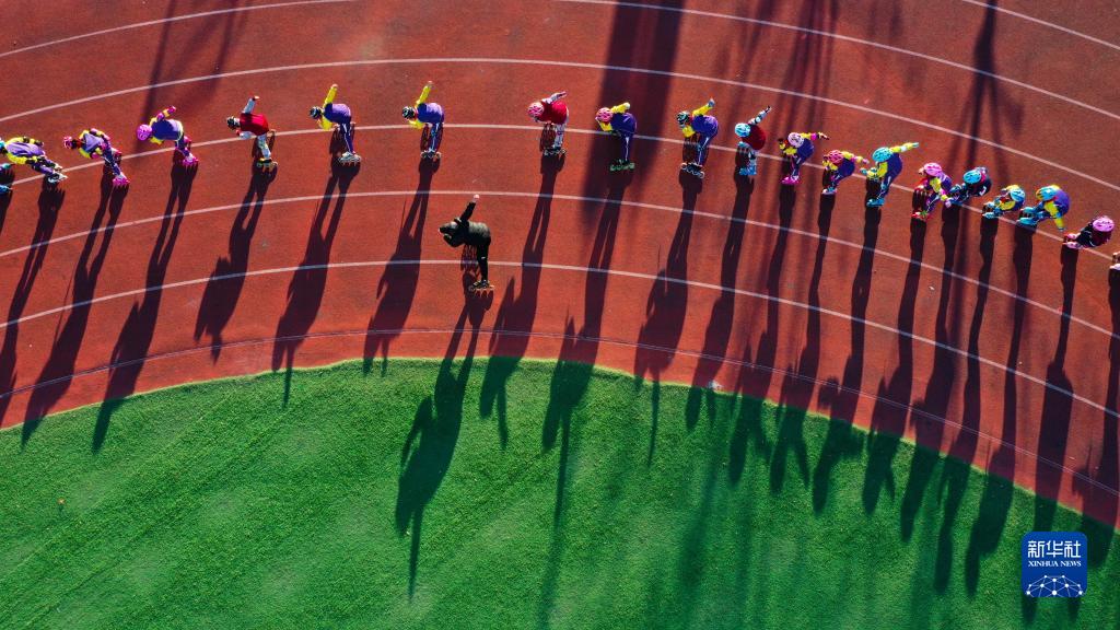 12月17日,河北省唐山市曹妃甸区唐海镇新立小学的学生在操场练习轮滑(无人机照片)。