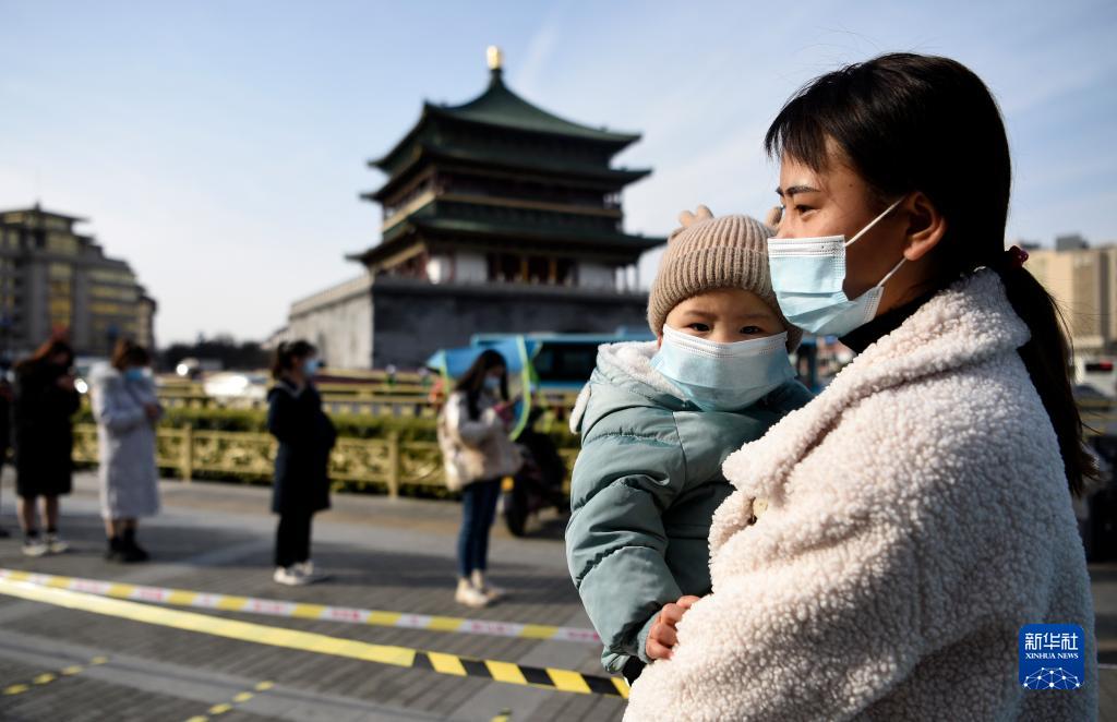 12月17日,在西安市钟楼附近的核酸检测点,一位妈妈抱着宝宝排队等待核酸检测。