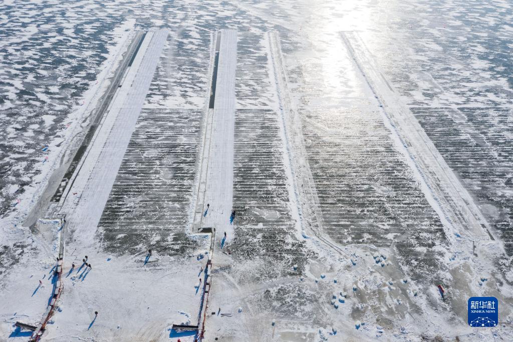 这是12月17日拍摄的松花江哈尔滨段被切割过的江面冰层(无人机照片)。