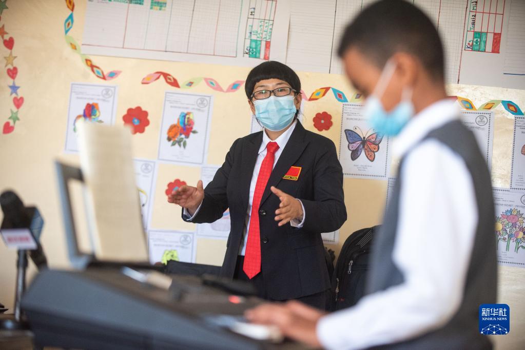 12月22日,在埃塞俄比亚首都亚的斯亚贝巴,中国援助埃塞俄比亚医疗队翻译何阳(左)教当地儿童唱中国歌曲。