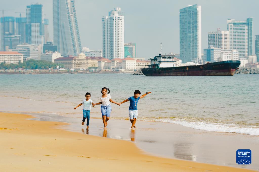 12月3日,在斯里兰卡科伦坡港口城,小朋友们在人工沙滩附近玩耍。