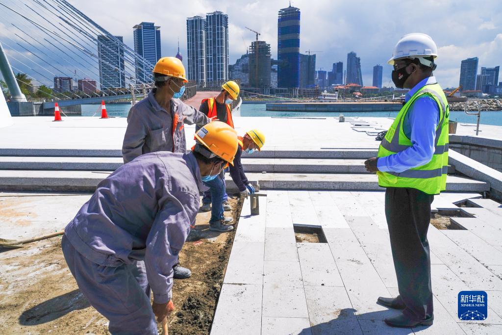 11月30日,在斯里兰卡科伦坡港口城,工程师桑吉瓦在施工现场检查。