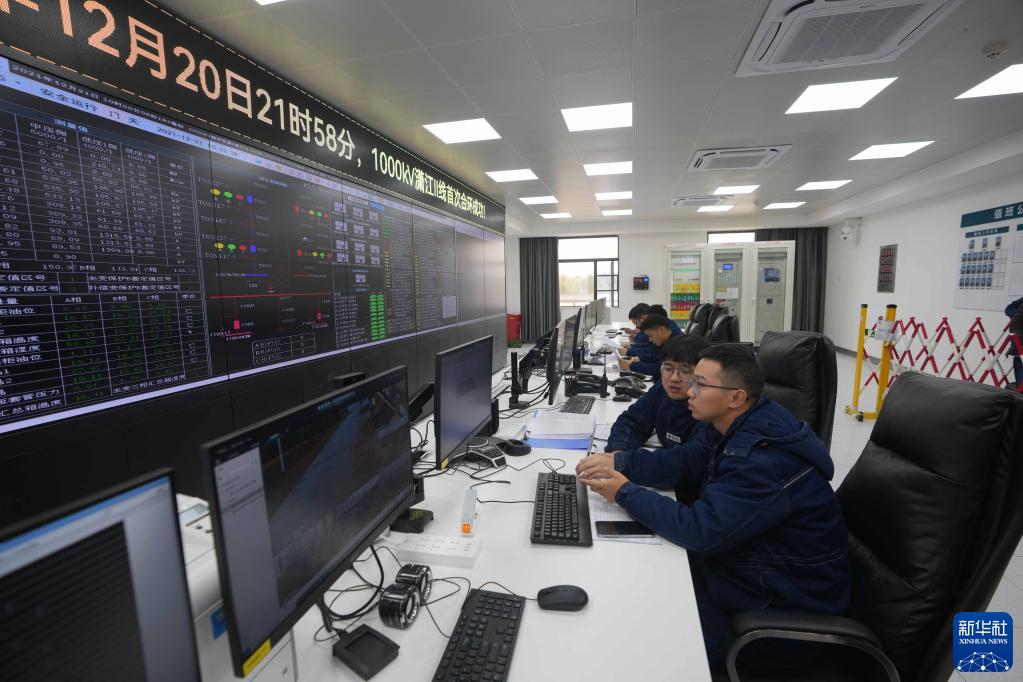 在位于南昌进贤县的南昌(赣江)1000千伏变电站,运行单位值班人员监控主控室大屏并讨论报文信息(12月21日摄)。