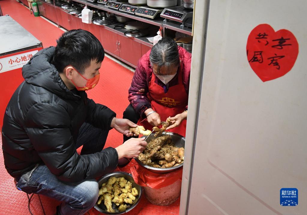 张广兵在共享厨房里和工作人员一起削姜皮(12月14日摄)。