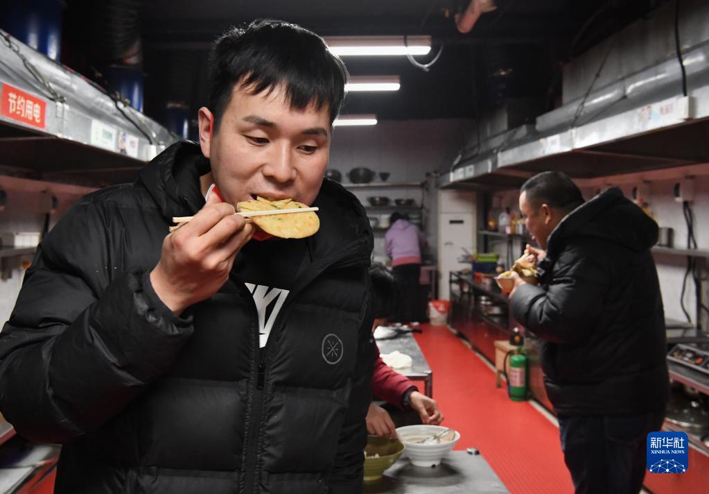 张广兵在患者家属做完早餐离开后,匆忙地吃早饭(12月14日摄)。