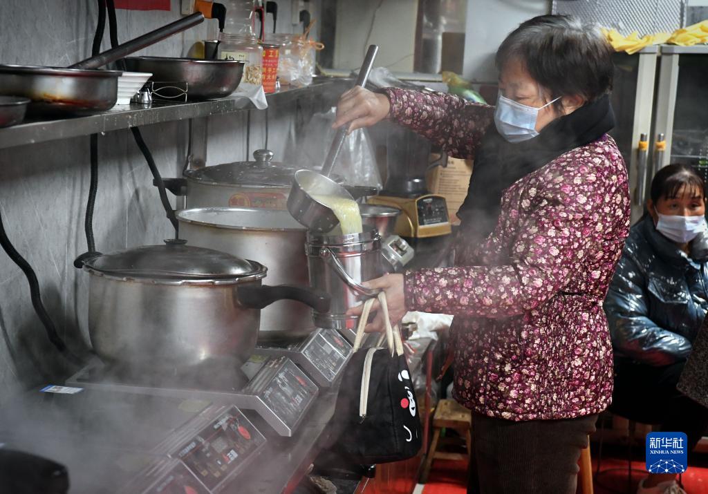 患者家属在共享厨房盛取免费的小米粥(12月14日摄)。