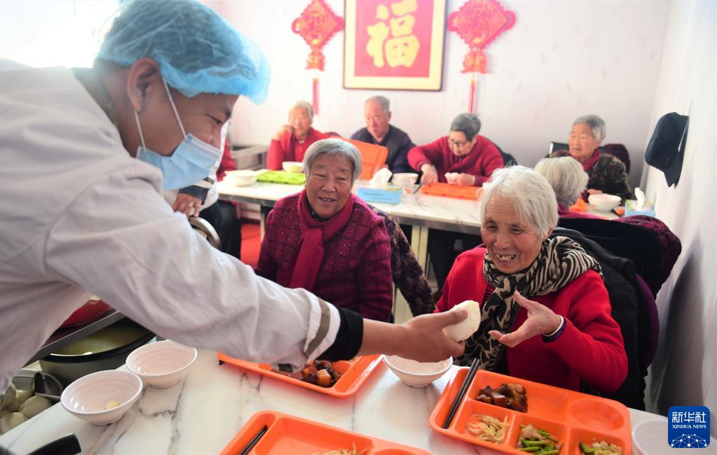 12月26日,青县人和镇村孝老食堂的志愿者为老人分配饭菜。