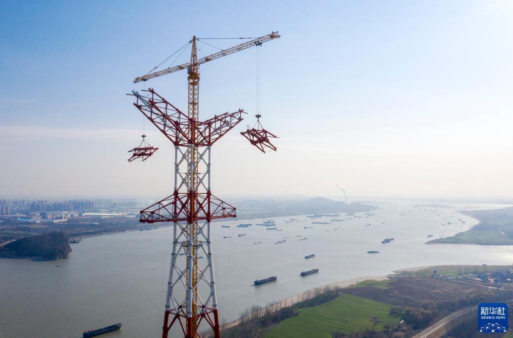 12月26日拍摄的长江大跨越输电钢管塔封顶施工现场(无人机照片)。
