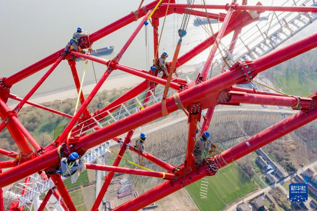 12月26日,安徽送变电工程有限公司施工人员在长江大跨越输电钢管塔封顶施工现场作业(无人机照片)。