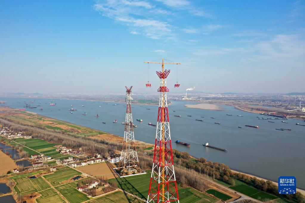 12月26日拍摄的长江大跨越输电钢管塔封顶施工现场(无人机照片)。