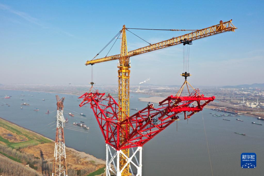 12月26日,安徽送变电工程有限公司施工人员在长江大跨越输电钢管塔封顶施工现场作业(无人机照片)。