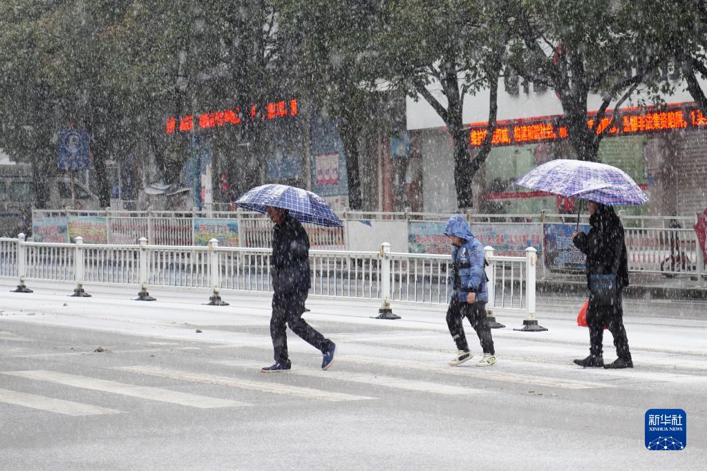 12月26日,在贵州省丹寨县县城,人们在雪中行走。