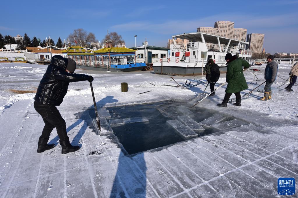 12月26日,在黑龙江省牡丹江市江滨码头附近,工人在采冰现场忙碌。