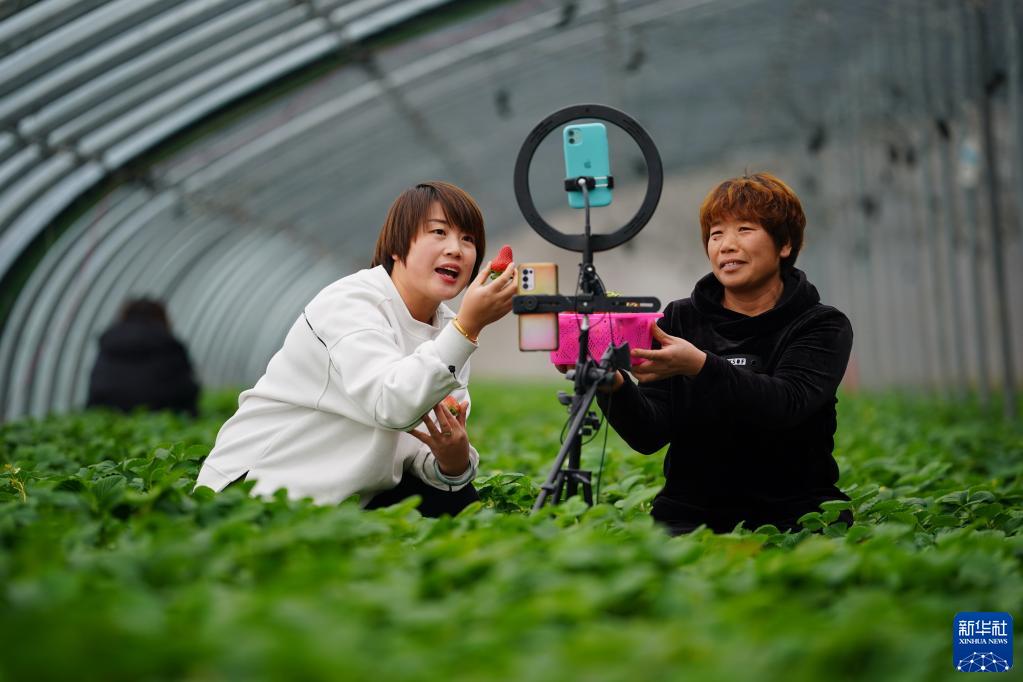 12月26日,河北省迁安市扣庄镇田庄村农民在大棚内利用直播的形式推介草莓。