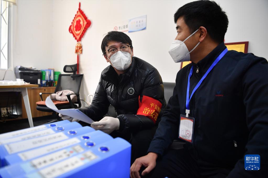 12月27日,在西安市雁塔区孟村小区,卢晨阳(左)在查阅孟村小区疫情防控台账。新华社记者 张博文 摄