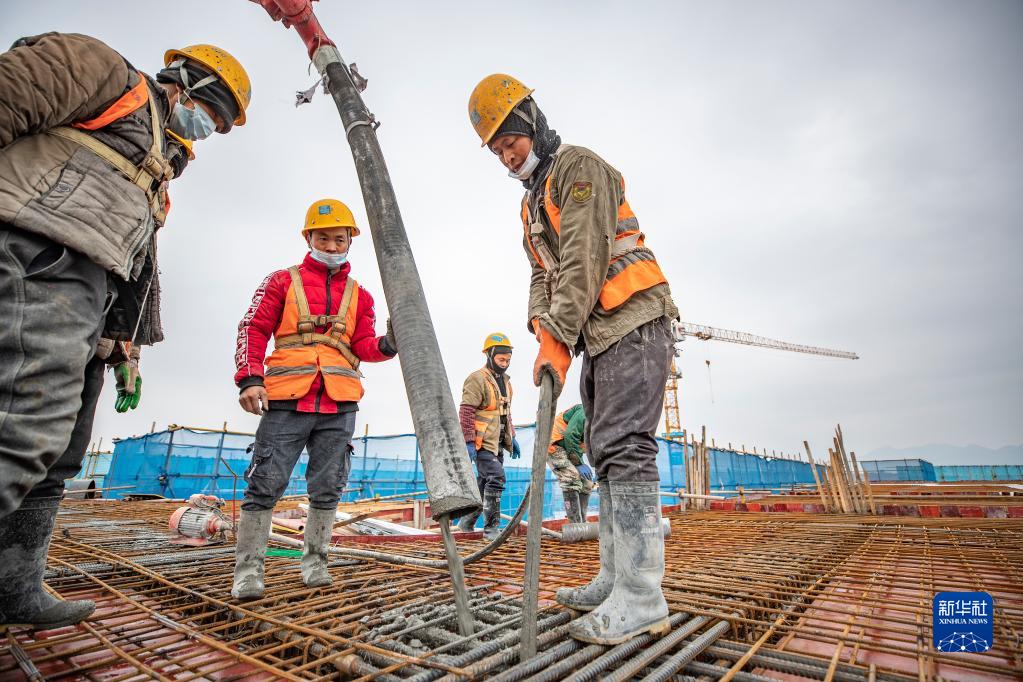 12月27日,在重庆江北国际机场T3B航站楼项目施工现场,施工人员在进行指廊主体结构封顶浇筑。