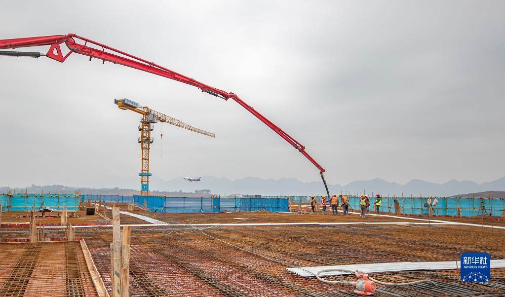12月27日,在重庆江北国际机场T3B航站楼项目施工现场,施工人员在进行指廊主体结构封顶浇筑。
