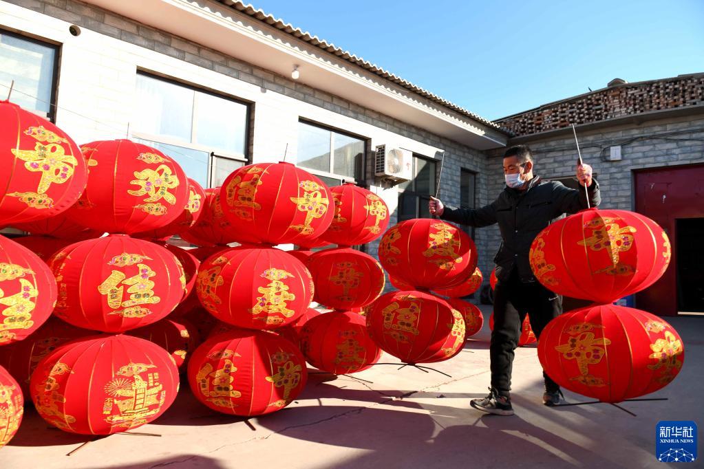 12月27日,在河北省石家庄市藁城区屯头村,一家宫灯企业的工人搬运宫灯。新华社发(许建园 摄)