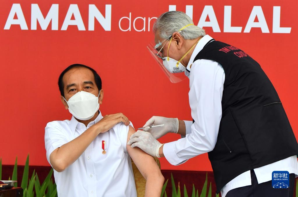 1月13日,印度尼西亚总统佐科(左)在雅加达总统府接种中国新冠疫苗。