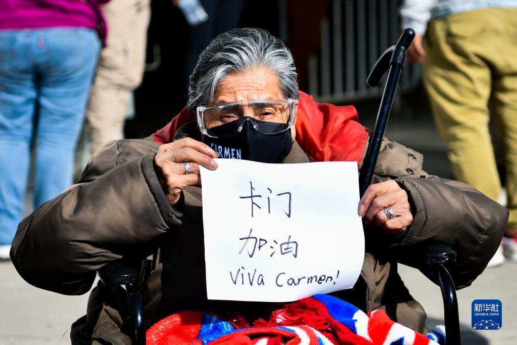 2月22日,在墨西哥埃卡特佩克,当天首位接种中国科兴新冠疫苗的74岁老人卡门完成接种后手持中西双语的祝福语。
