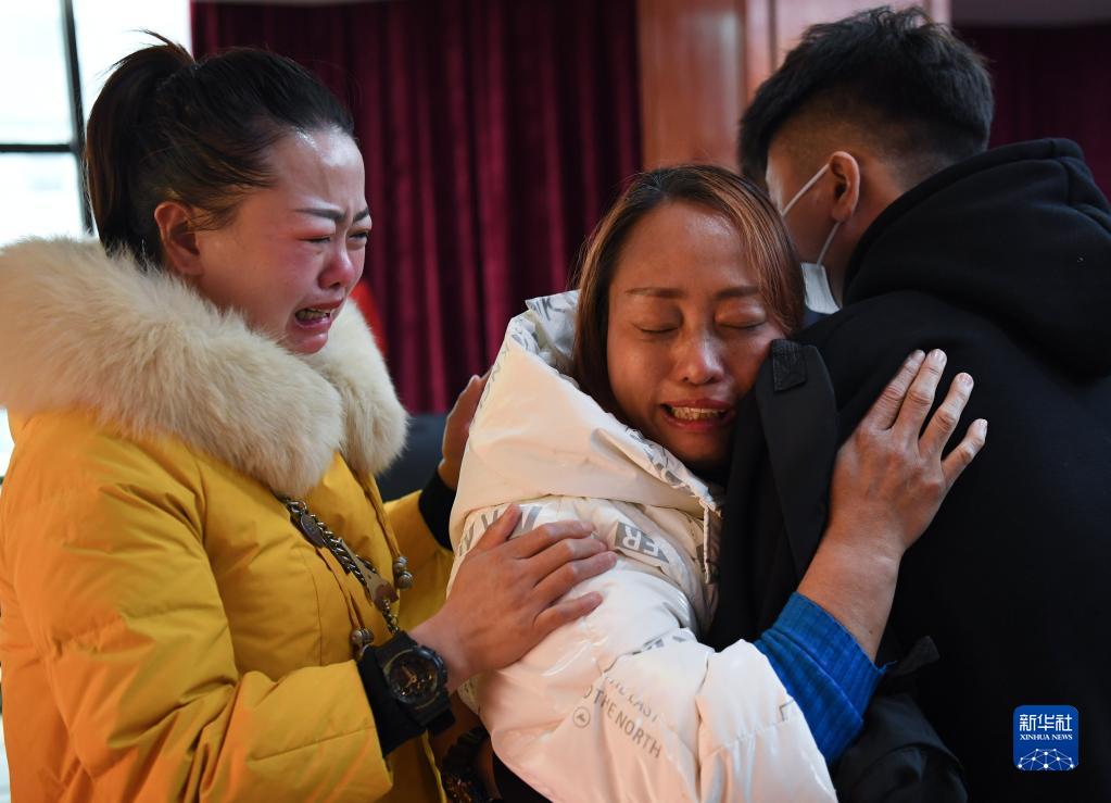 12月28日,在广州市公安局花都区分局刑警大队,罗艳(中)与寻找了22年的儿子拥抱在一起。