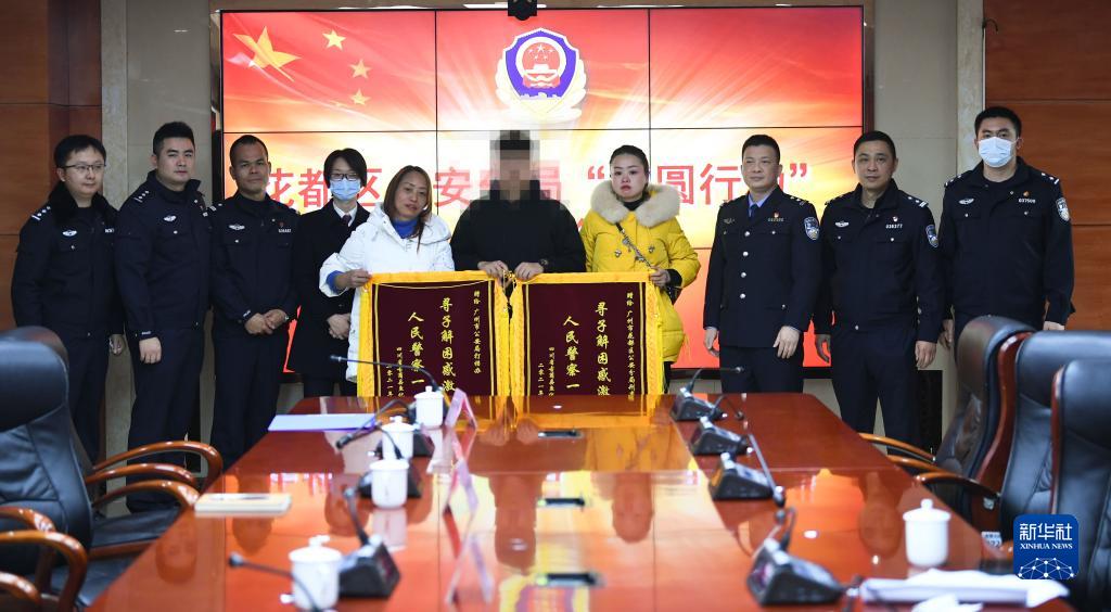 12月28日,在广州市公安局花都区分局刑警大队,罗艳(左五)一家人与办案民警合影留念。