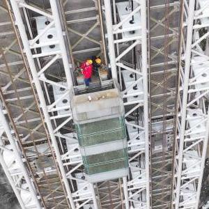 12月27日,湖南张家界武陵源景区百龙天梯工作人员在悬崖钢井架上巡检(无人机照片)。