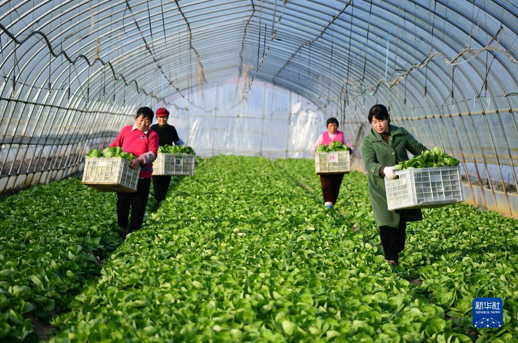12月28日,在安徽省肥西县花岗镇八里社区燕邦蔬菜种植农场,村民在采收蔬菜。