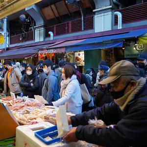 12月28日,一名日本东京阿美横町商店的工作人员将促销广告牌放在店门口。