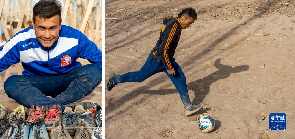 拼版照片:左图为网名为“努尔飞腿”的努尔麦麦提·西热甫在位于新疆喀什地区疏附县的家中展示被自己踢坏的足球鞋(11月13日摄);右图为努尔麦麦提在自家院里练习踢球(11月13日摄)。