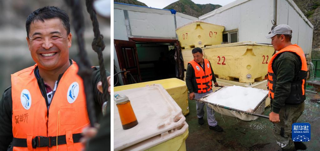 拼版照片:左图为在新疆尼勒克县喀拉苏乡一处冷水鱼养殖基地,吴斯班·阿拉勒拜(左)在工作(6月17日摄);右图为吴斯班·阿拉勒拜(左)在搬运用于保鲜冷水鱼的冰块(6月17日摄)。