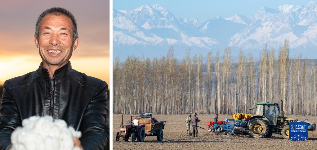 拼版照片:左图为新疆沙湾市棉农陆高林手捧棉花站在棉田旁(10月23日摄);右图为陆高林和工人在棉田进行机器播种(4月15日摄)。