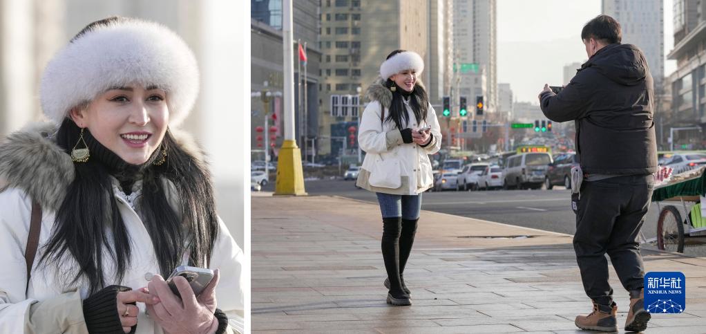 拼版照片:左图是在乌鲁木齐市沙依巴克区街头拍摄的一位媒体从业者娜地拉(12月28日摄);右图为娜地拉(左)和同事在乌鲁木齐市街头拍摄短视频(12月28日摄)。