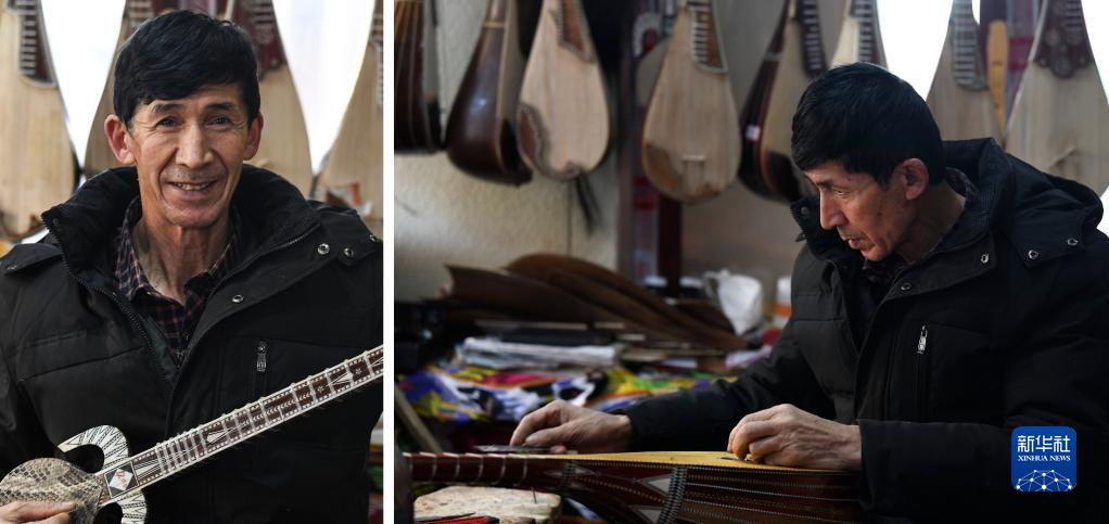 拼版照片:左图为手艺人艾尔肯·吐么尔在自己经营的位于乌鲁木齐市大巴扎景区内的乐器行里弹奏热瓦甫(12月28日摄);右图为艾尔肯·吐么尔在制作都塔尔(12月28日摄)。