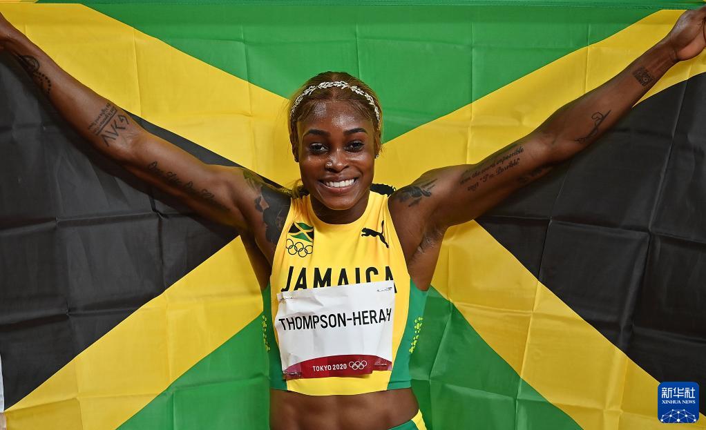 这是2021年7月31日,牙买加选手伊莱恩·汤普森夺得东京奥运会田径比赛女子100米冠军后庆祝。