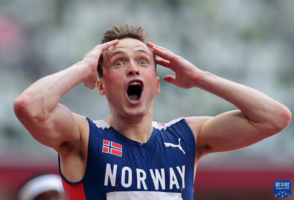 这是2021年8月3日,挪威选手沃霍尔姆在东京奥运会田径比赛男子400米栏比赛后庆祝夺冠。